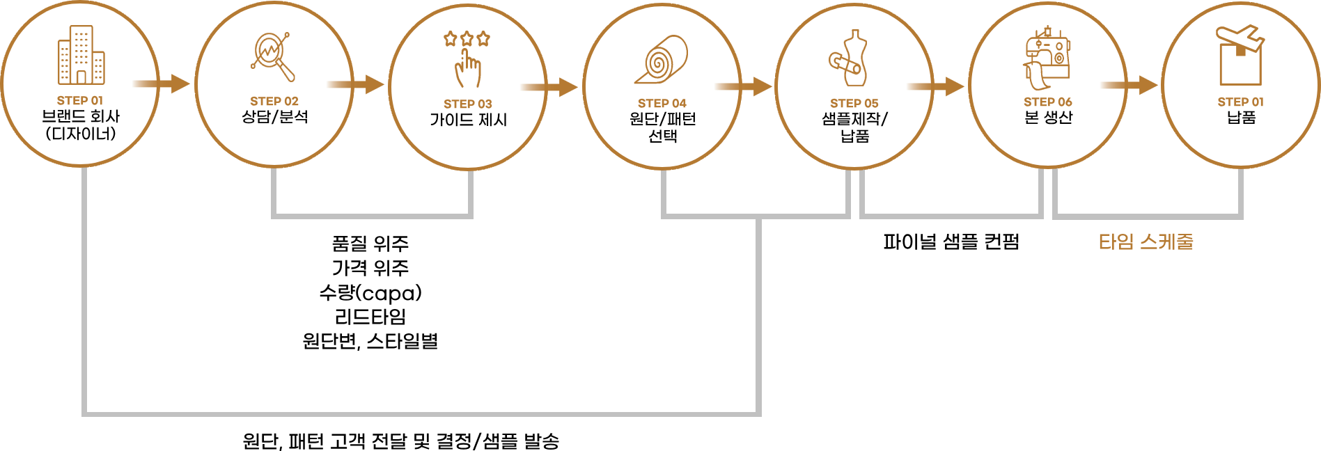 국내 및 중국 생산 네트워크를 구축하여 맞춤형 생산하고, 브랜드의 카테고리별 원부자재 소싱에서 생산까지 모든 밸류체인을 한번에 관리